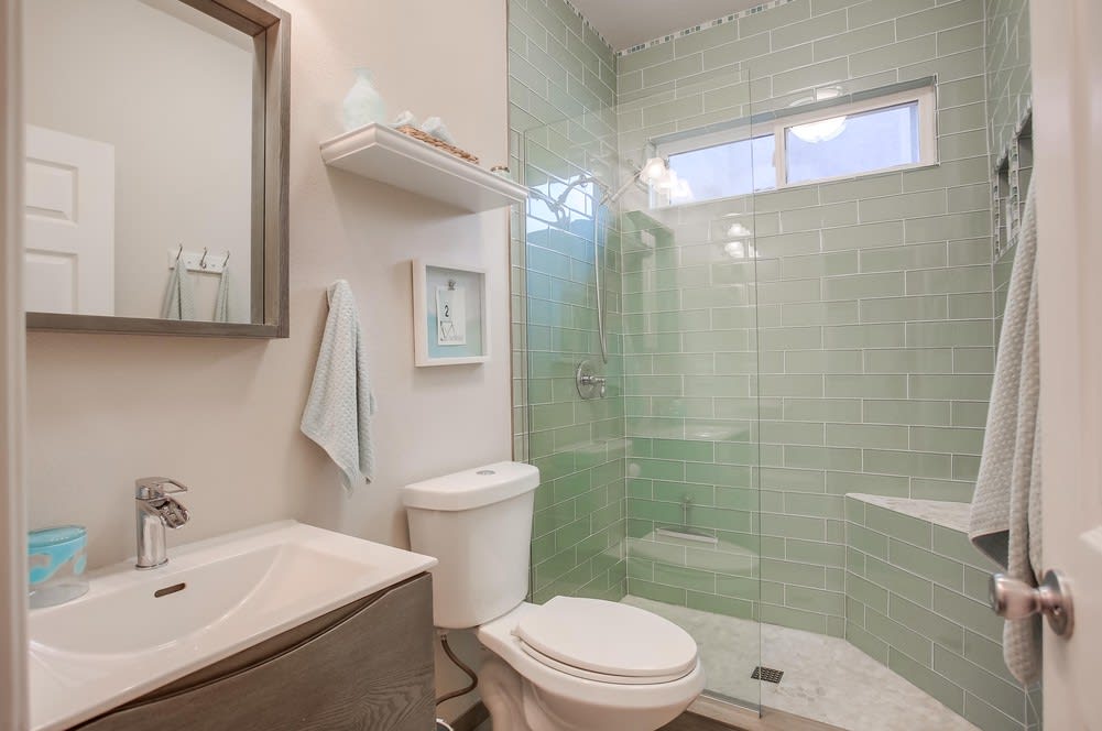 Downstairs features a bedroom and full bath with beautiful tile details, perfect for guests or even a permanent living quarters for the grandparents! Currently furnished as a formal dining room, the space below the stairs can also be used as a living room.
