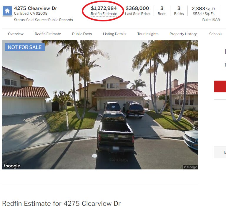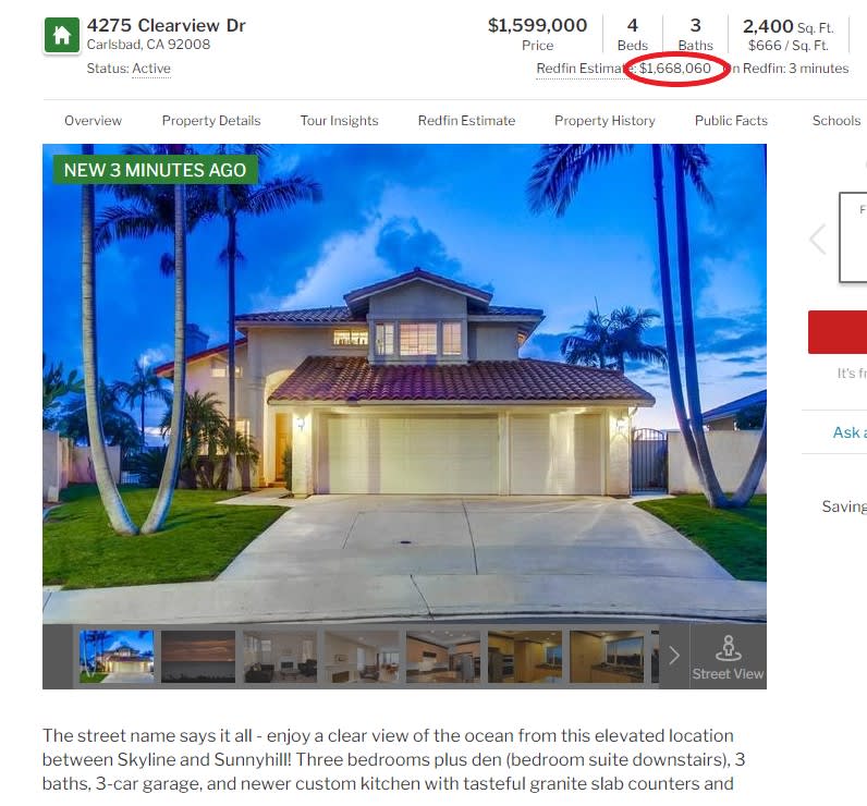 The street name says it all – enjoy a clear view of the ocean from this elevated location between Skyline and Sunnyhill! Three bedrooms plus den (bedroom suite downstairs), 3 baths, 3-car garage, and newer custom kitchen with tasteful granite slab counters and great ocean view from the kitchen sink. The pie-shaped 9,331sf lot helps to expand the view/privacy and includes a pool/spa too! Needs TLC, but it’s cheap – the house down the street is $3.5M. The Best View is available in Carlsbad!