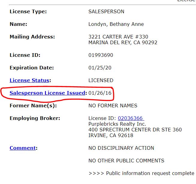 We don’t have to look very far to see how trustworthy they are. They say Bethany has ’10 YEARS EXP’, but when you go on the DRE website, this is what you’ll see – she has been licensed since 2016 (you can always get a hint from the license numbers, which are issued sequentially):