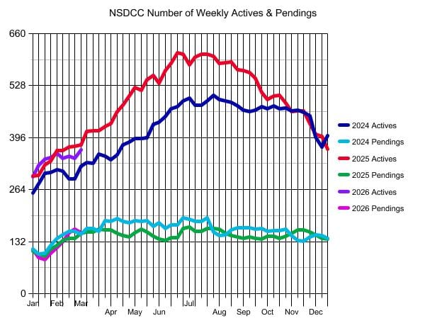 The NSDCC actives count jumped +21 this week and is closing in on last year’s count. The pendings also got in line with previous years too.