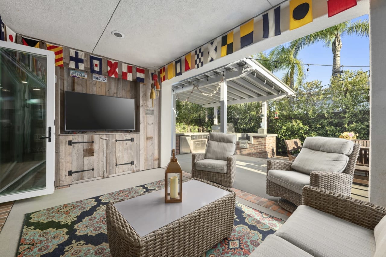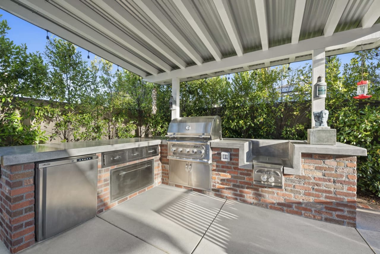 Additionally, the outdoors is perfect for entertaining! With a stainless steel kitchen, which includes a fridge, an entertainment area, a fire pit, and a grassy yard, there's an abundance of activities and space for all ages.