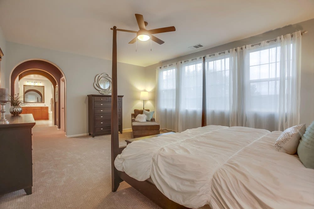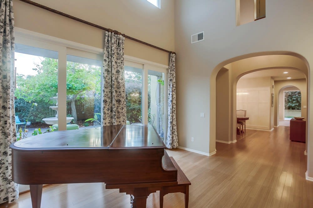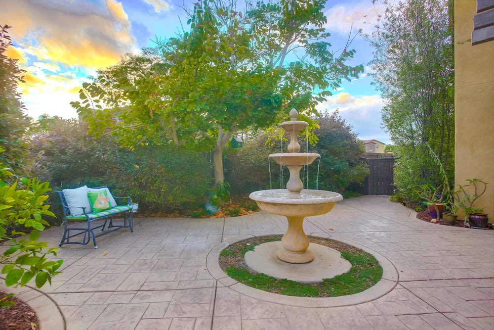 Enjoy the right-sized granite kitchen with a chef's island that combines nicely with the extra-large family room overlooking a private backyard with fruit and avocado trees! Features include new carpet and paint, secluded downstairs bedroom suite, piano room, massive master suite, Owned Solar, and the perfect courtyard in front! The corner location on a culdesac ensures privacy and some extra light too.