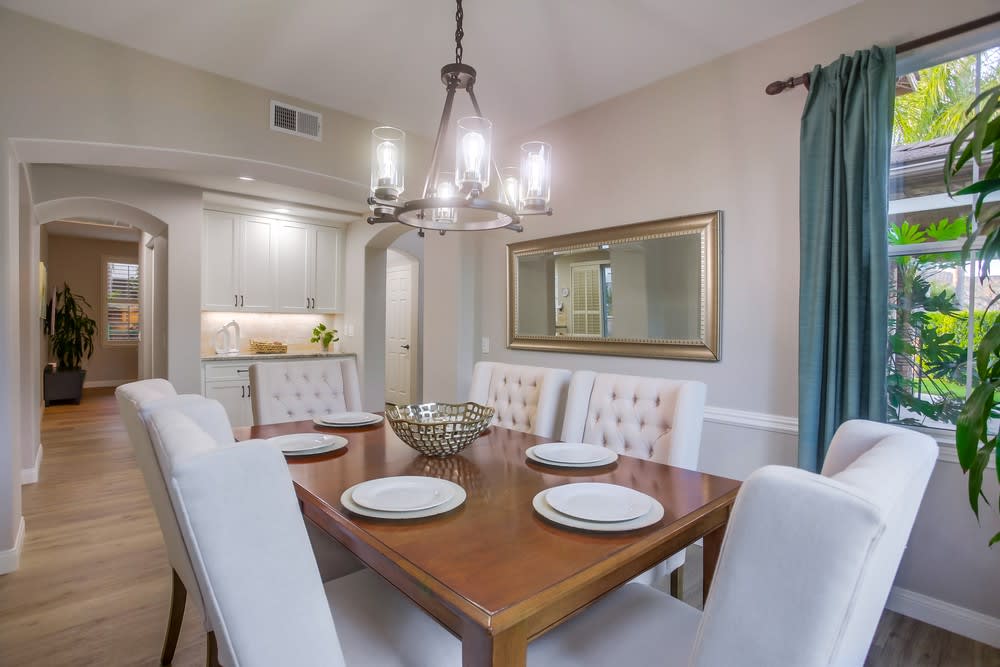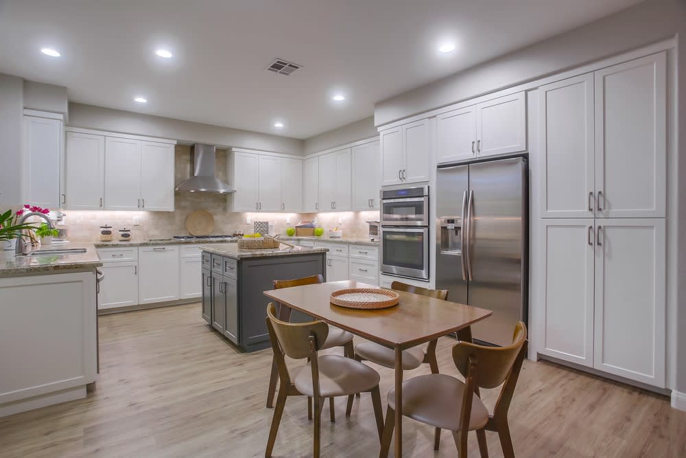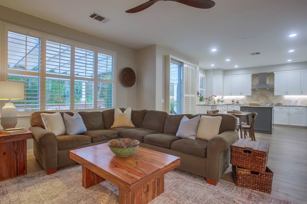 The open great room is just small enough so you don't have to yell when talking from the tv area to the kitchen - the perfect size. Remodeled kitchen features two-tone granite creating a custom look. White cabinets, breakfast nook, and immediate access to the quiet backyard.