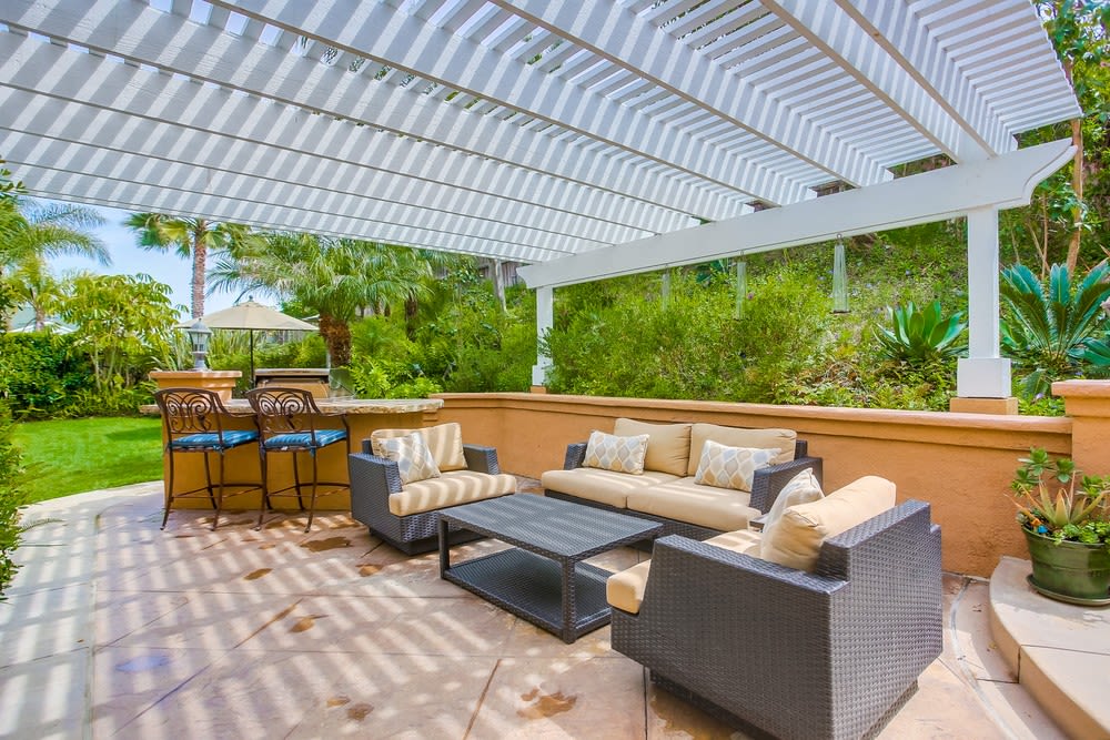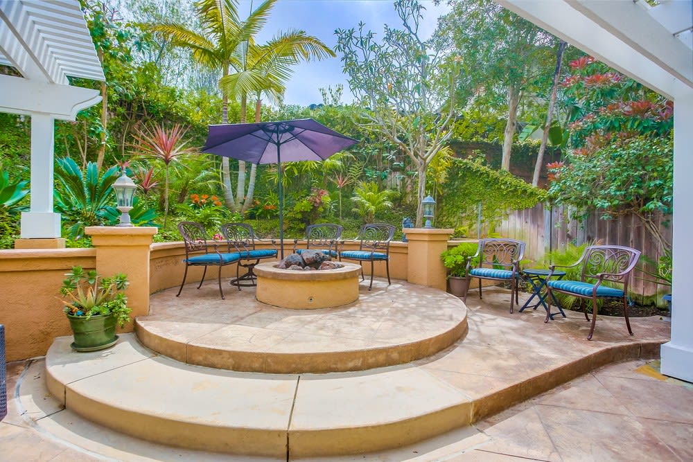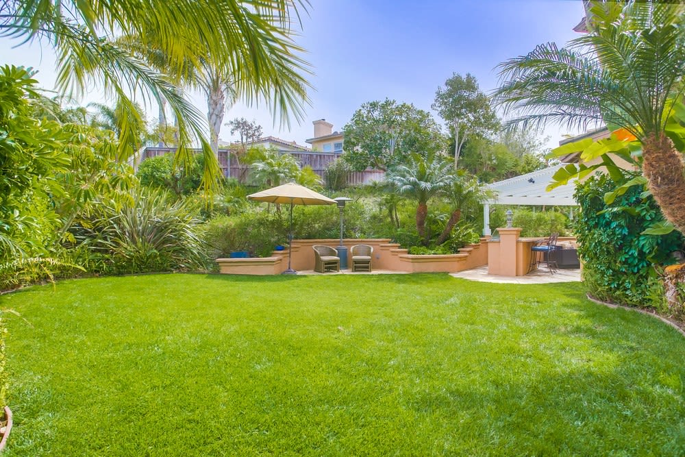 This pie-shaped lot is incredible! Right when you walk through the front gate, it immediately opens up to the uniyard - one large patch of grass that wraps to the back that features stamped concrete, bbq island with granite, fire pit, multiple seating areas for entertaining, and lush tropical landscaping.