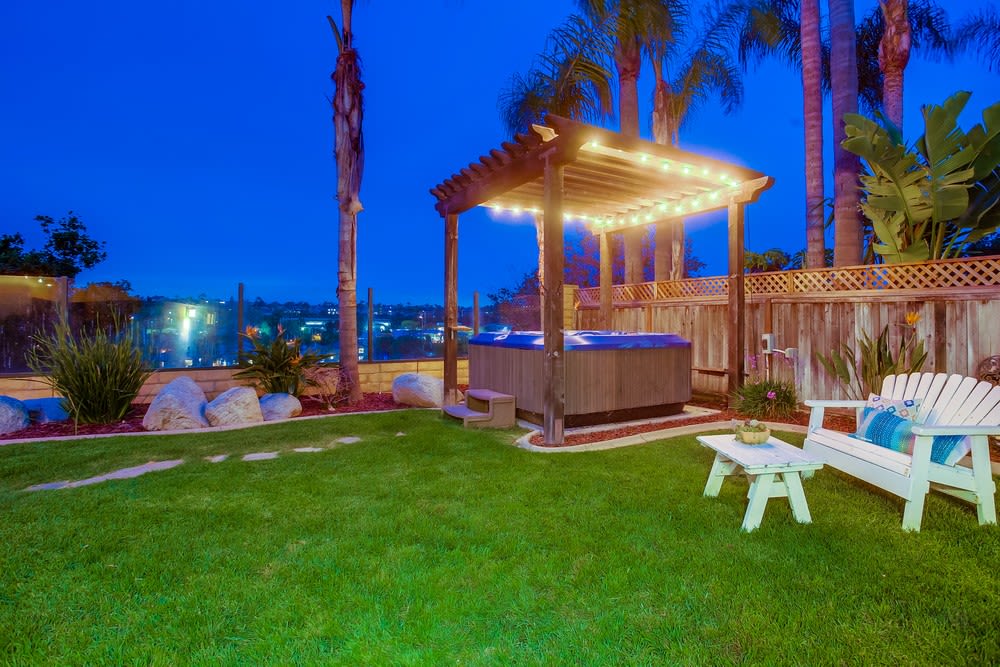 Let's start with this backyard - we got everything! Includes a tropical pool, water slide, swim-up grotto, built-in BBQ island, fire pit in its own little section, outdoor shower, and plenty of party space. Great panoramic views with minimal noise to create a peaceful setting. Grass area for your dogs and a separate area for the hot tub!