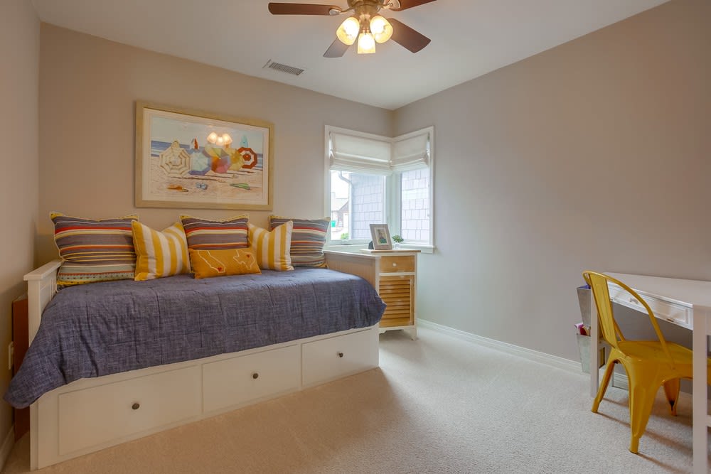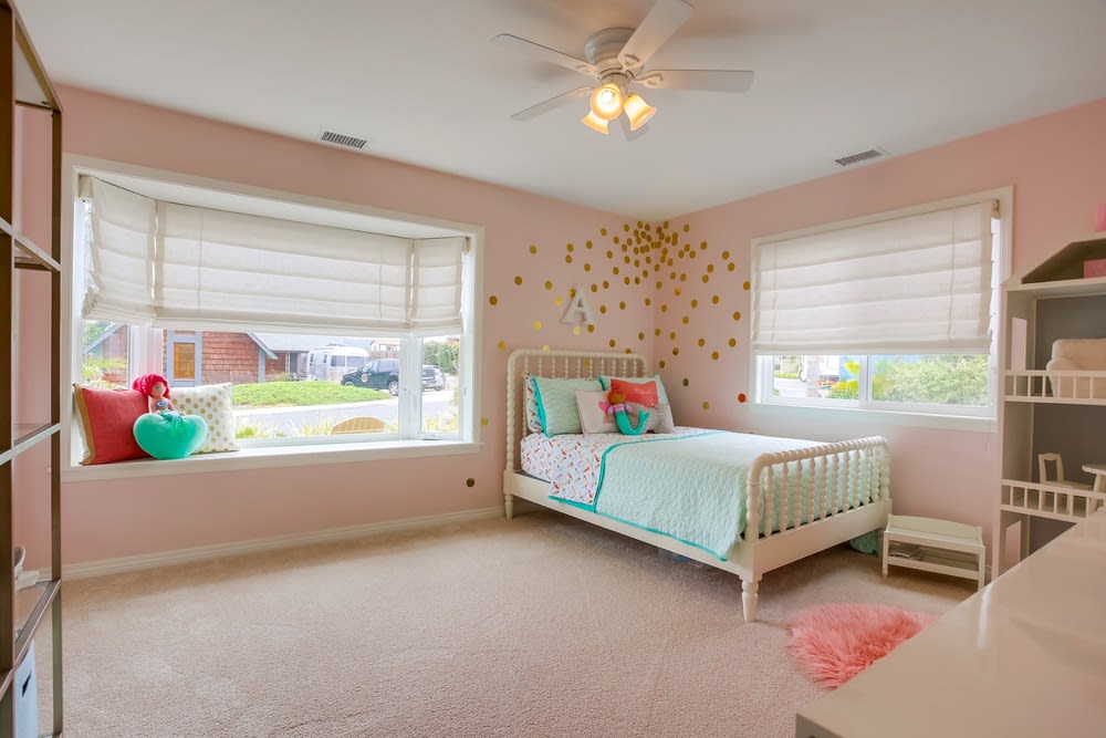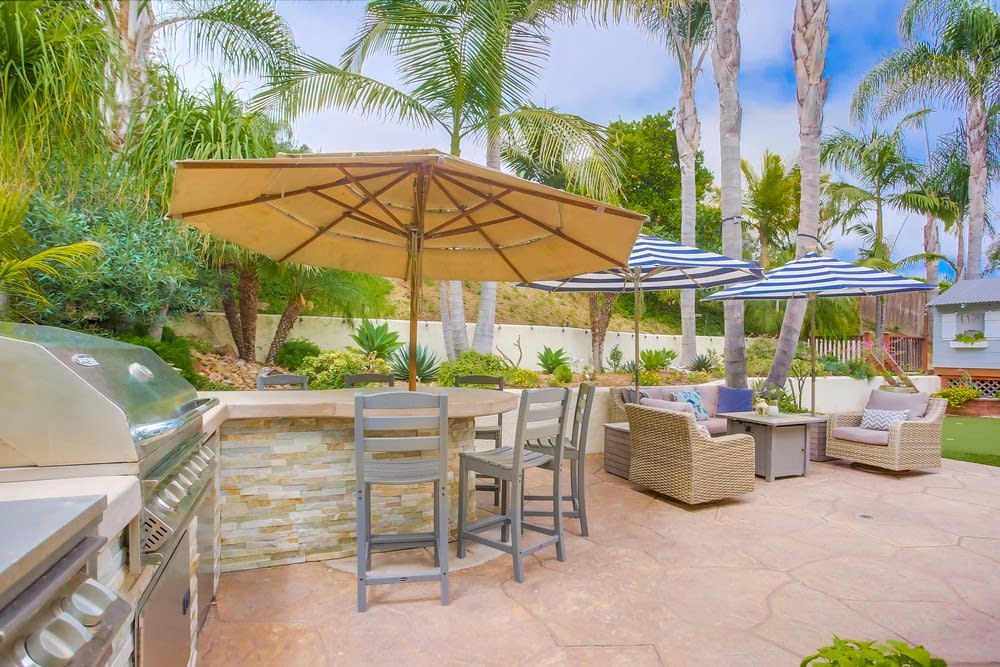 The backyard features a high-top table, grill, seating area, grassy yard, and a playhouse! Perfect for all ages to enjoy the sunny Carlsbad weather.