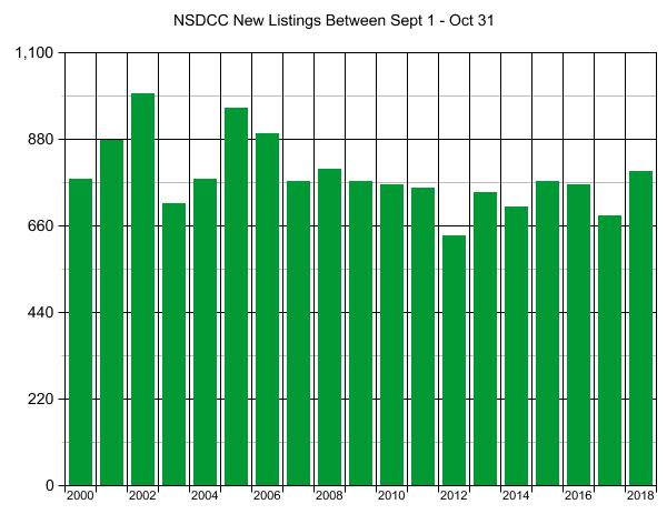 Here is the graph of the NSDCC new listings for September-October, and how they compare to previous years. There are no real signs of panic here, and, if anything, it shows us that comparing to last year is measuring against one of the lowest amounts ever: